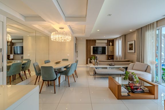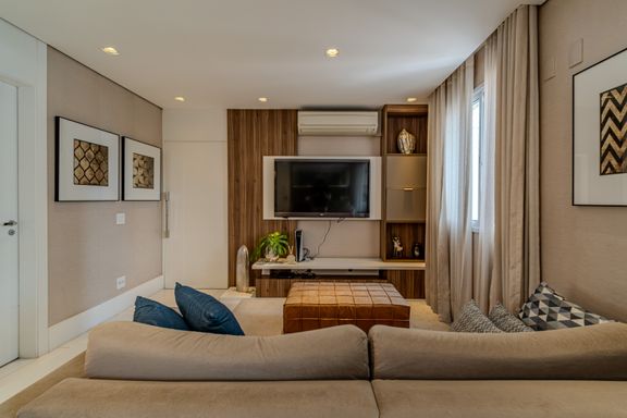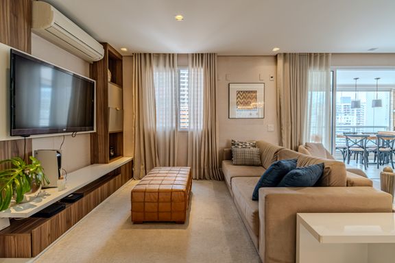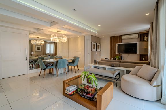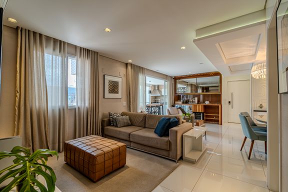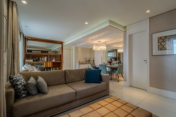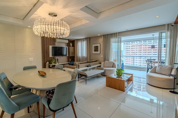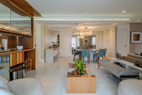 O apartamento de 116 m² é um verdadeiro oásis de luxo e praticidade. A sala é subdividida em três ambientes elegantes: totalmente mobiliado, finamente decorado e climatizado com splits potentes. A área de jantar conta com mesa oval para seis lugares e cômoda laqueada. O estar íntimo traz TV embutida e sofás confortáveis, enquanto o estar principal destaca uma delicada adega climatizada de vinhos integrada à varanda gourmet envidraçada.